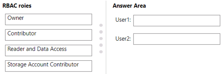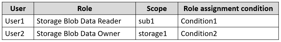 您需要为名为 User1 的用户分配一个角色,以确保该用户可以访问 storage1 中的 blob 数据。角色分配必须支持条件。 你能为 User1 分配哪两个角色?每个正确答案都代表一个完整的解决方案。 注意:每个正确选择值一分。热点 -