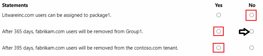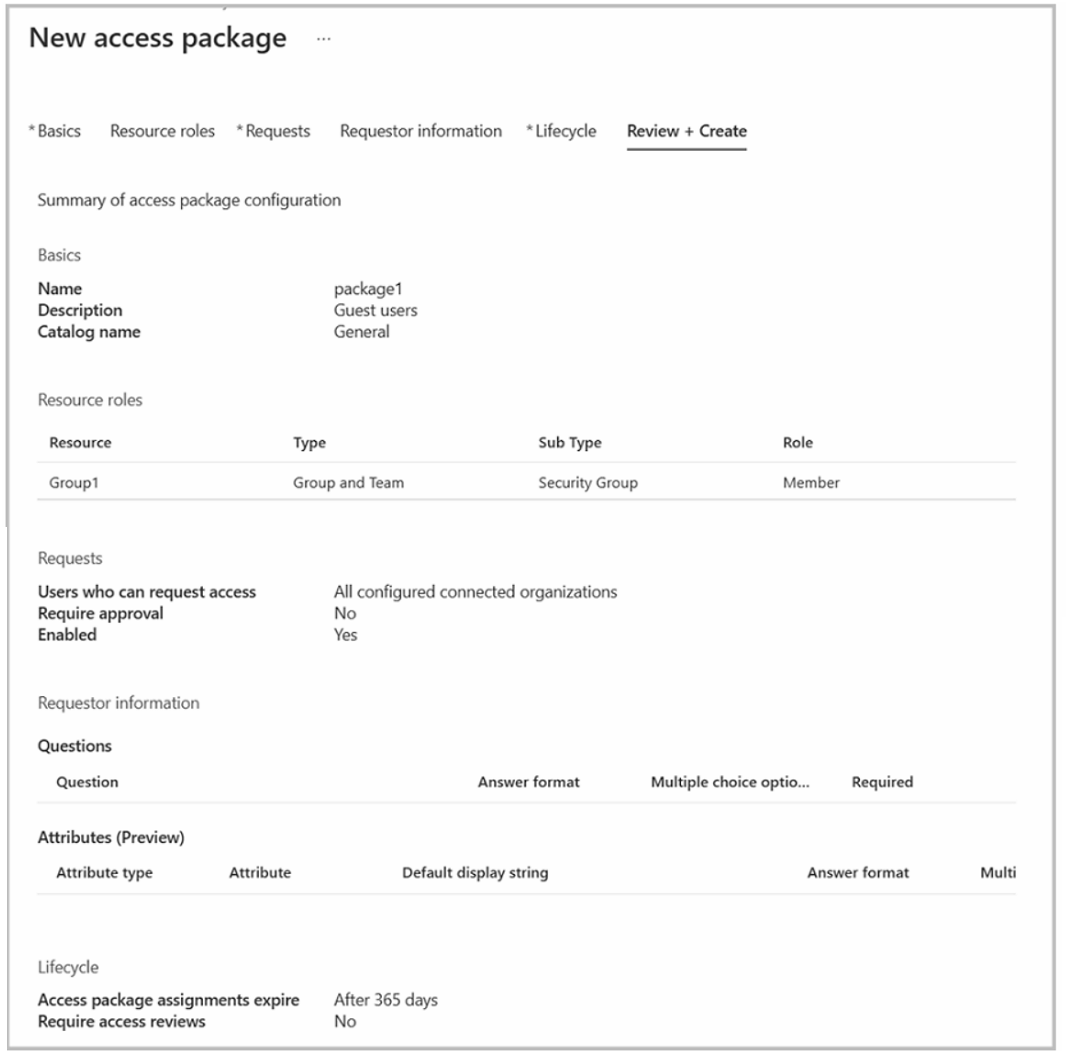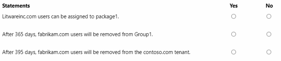 您有一个名为 contoso.com 的 Azure AD 租户。 您有两个外部合作伙伴组织,分别名为 fabrikam.com 和 litwareinc.com。Fabrikam.com 配置为连接组织。 按照访问包图示所示,创建一个访问包。(单击“访问包”选项卡。)你有一个名为“Subscription1”的 Azure 订阅,其中包含一个名为“VNet1”的虚拟网络。VNet1 位于名为“RG1”的资源组中。