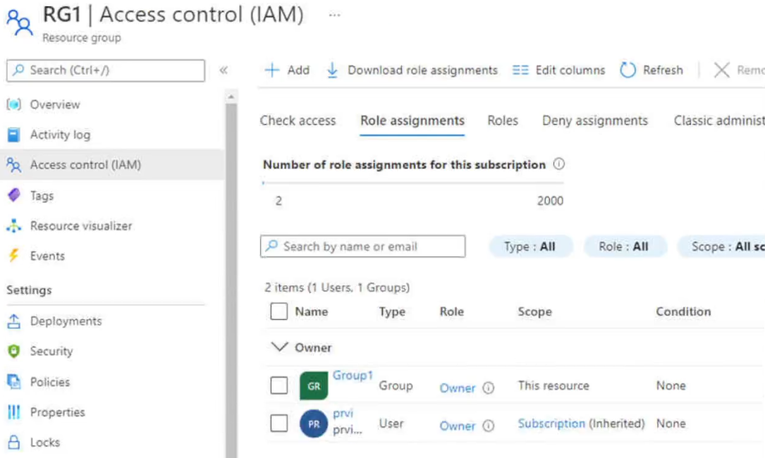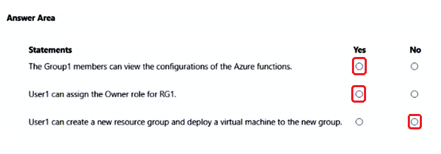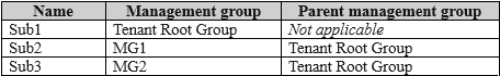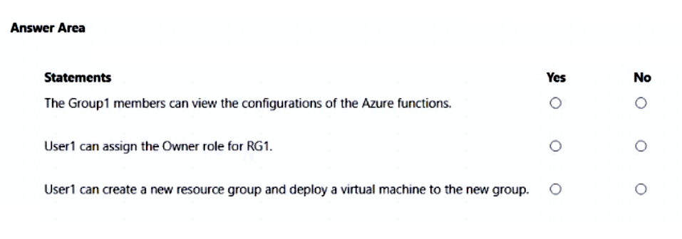 - 您有三个 Azure 订阅,分别名为 Sub1、Sub2 和 Sub3,它们链接到一个 Azure AD 租户。 该租户包含一个名为 User1 的用户、一个名为 Group1 的安全组和一个名为 MG1 的管理组。User 是 Group1 的成员。 Sub1 和 Sub2 是 MG1 的成员。Sub1 包含一个名为 RG1 的资源组。RG1 包含五个 Azure 函数。 您为 MG1 创建以下角色分配: • 第 1 组:读者 • 用户 1:用户访问管理员 您为用户分配 Sub1 和 Sub2 的虚拟机贡献者角色。您有一个 Azure 订阅,其中包含下表所示的资源。