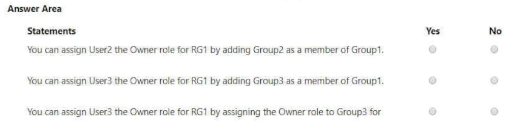 名为 User1 的用户对于 Subscription1 具有以下角色: • 阅读器 • 安全管理员 • 安全读取器 您需要确保 User1 可以将 VNet1 的读者角色分配给其他用户。 你应该怎么做?您有一个 Azure AD 租户,其中包含下表所示的组。