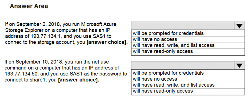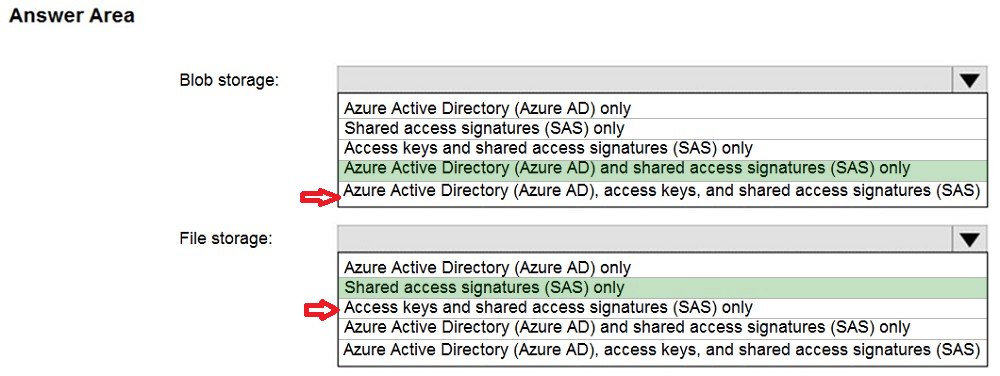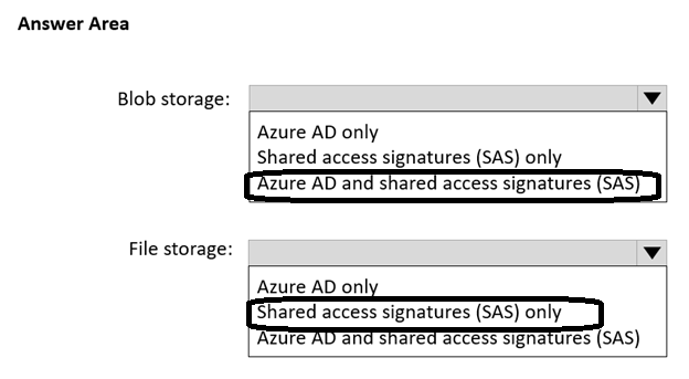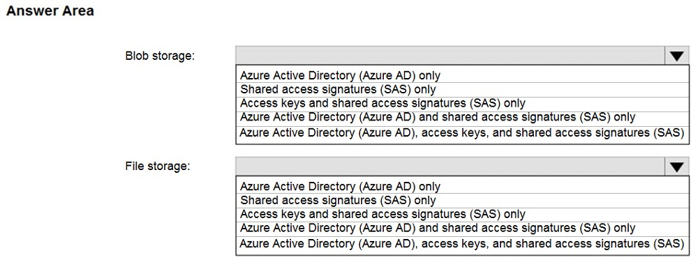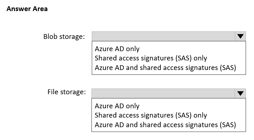 - 您有一个名为 storage1 的 Azure 存储帐户,该帐户使用 Azure Blob 存储和 Azure 文件存储。 您需要使用 AzCopy 将数据复制到 storage1 中的 blob 存储和文件存储。 对于每种类型的存储,您应该使用哪种身份验证方法?请在答案区域中选择相应的选项来回答。 注意:每个正确选择值一分。热点