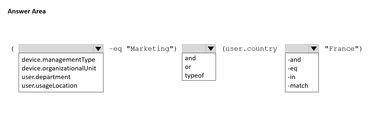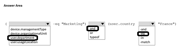 - 您有一个 Azure AD 租户。 您需要创建一个仅包含法国营销部门成员的 Microsoft 365 组。 您应该如何完成动态成员资格规则?请在答案区域中选择相应的选项进行回答。 注意:每个正确答案值一分。热点