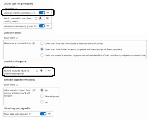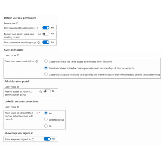 - 您有一个 Azure AD 租户。 您需要修改租户的默认用户角色权限设置。解决方案必须满足以下要求: • 必须阻止标准用户创建新的服务主体。 • 标准用户只能使用 PowerShell 或 Microsoft Graph 来管理自己的 Azure 资源。 您应该修改哪两个设置?要回答这个问题,请在答案区域中选择相应的设置。 注意:每个正确答案值一分。热点 -