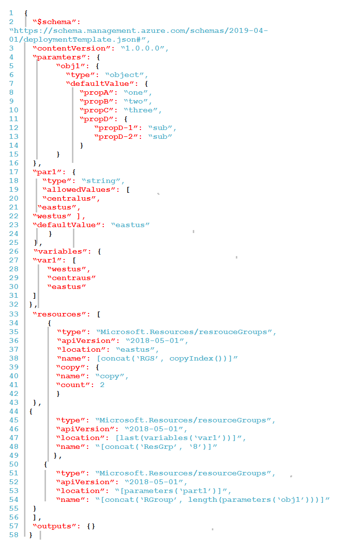 您购买了新的 Azure 订阅。 您创建一个名为 deploy.json 的 Azure 资源管理器 (ARM) 模板,如下图所示。您的本地网络包含 VPN 网关。