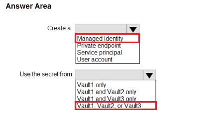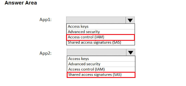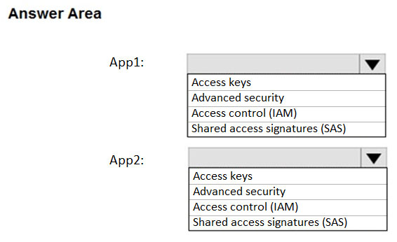 您有一个名为 storage1 的 Azure 存储帐户。 你有一个名为 App1 的 Azure 应用服务应用和一个名为 App2 的应用,它们在 Azure 容器实例中运行。每个应用都使用一个托管标识。 您需要确保 App1 和 App2 可以从 storage1 读取 blob。该解决方案必须满足以下要求: ✑ 尽量减少使用的秘密数量。 ✑ 确保 App2 在接下来的 30 天内只能从 storage1 读取数据。 您应该为每个应用在存储1中配置什么?请在答案区域中选择相应的选项来回答。 注意:每个正确选择值一分。 热点区域:热点 -