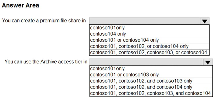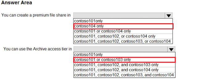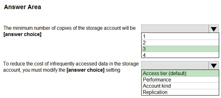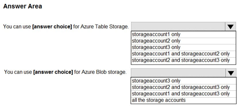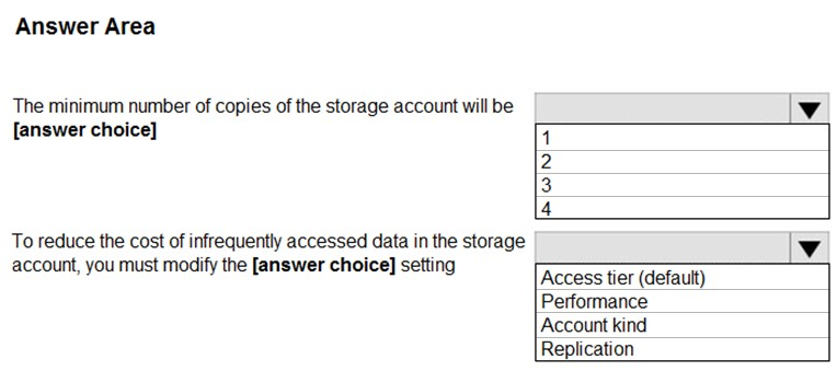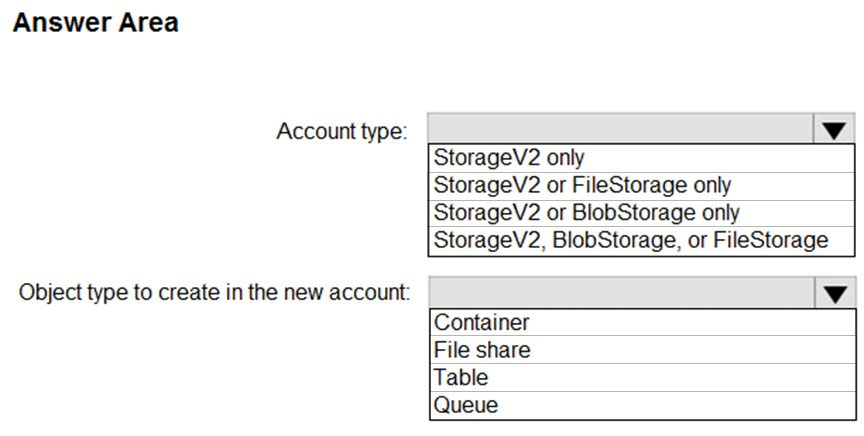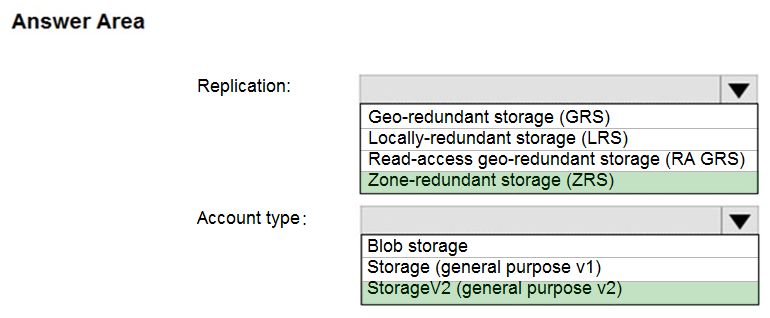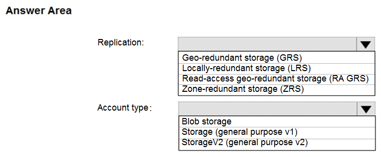 您计划在美国东部 2 的 Azure 区域创建一个 Azure 存储帐户。 您需要创建一个满足以下要求的存储帐户: ✑ 同步复制。 ✑ 如果区域中的单个数据中心发生故障,仍然可用。 您应该如何配置存储帐户?请在答案区域中选择相应的选项来回答。 注意:每个正确选择值一分。 热点区域:您计划使用 Azure 导入/导出服务将文件复制到存储帐户。