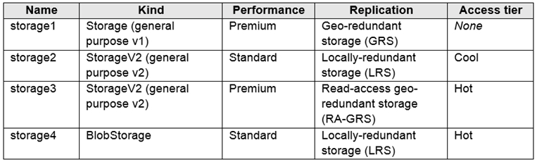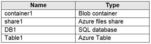使用共享访问签名 (SAS) 授予客户端对 storage1 的访问权限。 您需要确保用户在生成超过七天时间段的 SAS 时收到警告消息。 您应该如何进行存储?您有一个名为 Subscription1 的 Azure 订阅,其中包含下表所示的存储帐户: