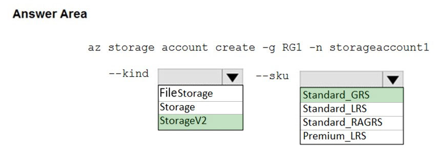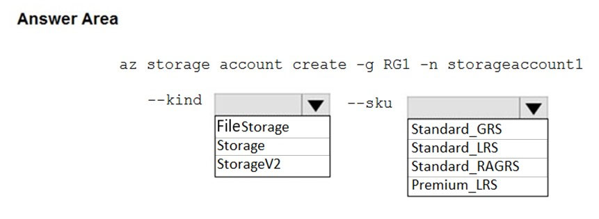 您需要创建一个满足以下要求的 Azure 存储帐户: ✑ 降低成本 ✑ 支持热、冷和存档 blob 层 ✑ 如果灾难影响帐户所在的 Azure 区域,则提供容错功能 你应该如何完成这个命令?请在答案区域中选择相应的选项来回答。 注意:每个正确选择值一分。 热点区域:您有一个 Azure 订阅,其中包含下表中的资源。