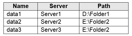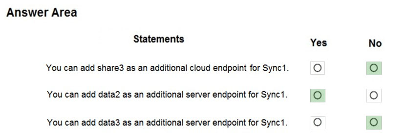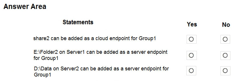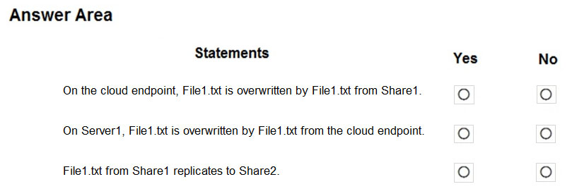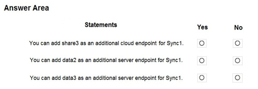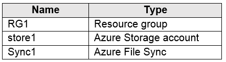 你有一个名为 Sync1 的同步组,该组包含一个云端点。该云端点包含一个名为 File1.txt 的文件。 您的本地网络包含运行 Windows Server 2016 的服务器。服务器的配置如下表所示。您有一个 Azure 订阅,其中包含下表所示的存储帐户。