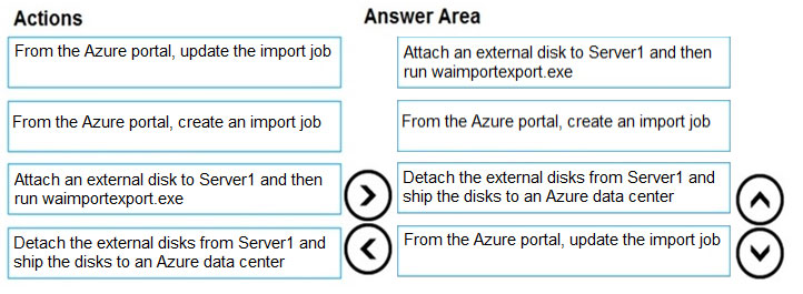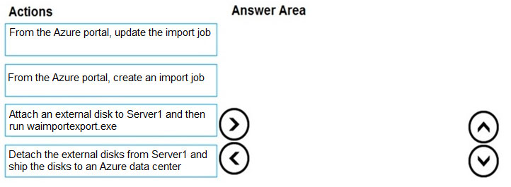 您有一个包含存储帐户的 Azure 订阅。 您有一个名为 Server1 的本地服务器,运行 Windows Server 2016。Server1 有 2 TB 的数据。 您需要使用 Azure 导入/导出服务将数据传输到存储帐户。 你应该按照什么顺序执行这些操作?要回答这个问题,请将所有操作从操作列表移到答案区域,并按正确的顺序排列它们。 注意:答案选项的正确顺序不止一个。您将根据您选择的任何正确顺序获得分数。 选择并放置:热点 -