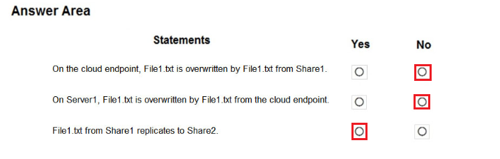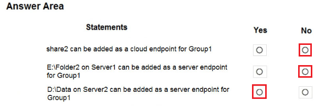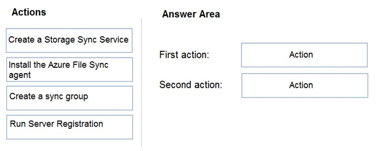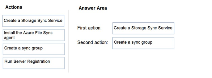 您有一个包含 Azure 文件共享的 Azure 订阅。 您有一个名为 Server1 的本地服务器,运行 Windows Server 2016。 您计划在 Server1 和 Azure 文件共享之间设置 Azure 文件同步。 您需要为计划的 Azure 文件同步准备订阅。 您应该在 Azure 订阅中执行哪两项操作?要回答这个问题,请将相应的操作拖到正确的目标。每个操作可以使用一次、多次或根本不使用。您可能需要拖动窗格之间的拆分条或滚动查看内容。 注意:每个正确选择值一分。 选择并放置:热点 -