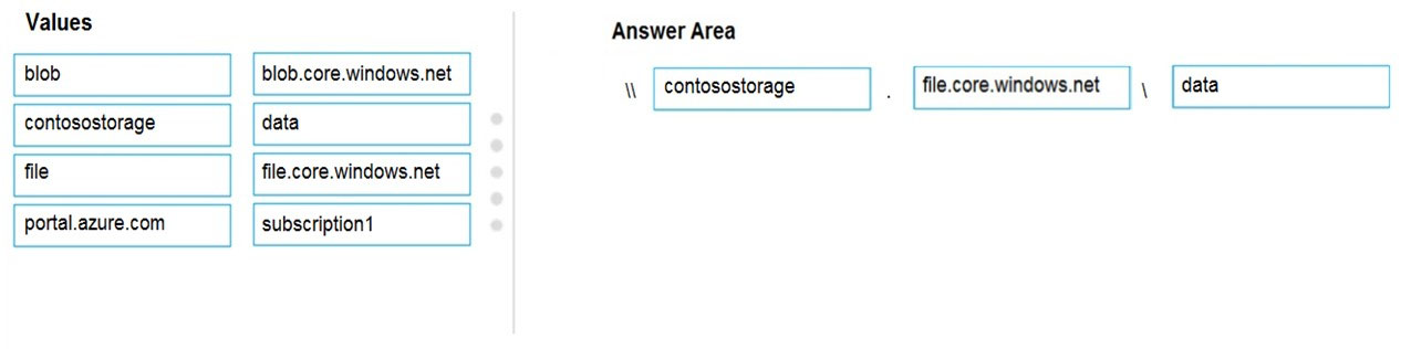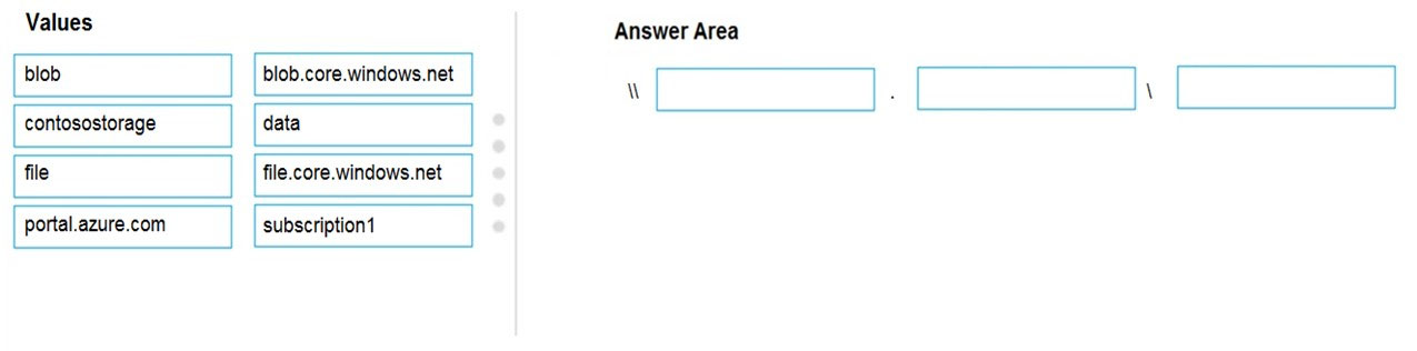 您有一个名为 Subscription1 的 Azure 订阅。 创建一个名为 contosostorage 的 Azure 存储帐户,然后创建一个名为 data 的文件共享。 您应该在引用数据文件共享中文件的脚本中包含哪个 UNC 路径?要回答这个问题,请将相应的值拖动到正确的目标。每个值可以使用一次、多次或根本不使用。您可能需要在窗格之间拖动拆分条或滚动查看内容。 注意:每个正确选择值一分。 选择并放置:热点 -
