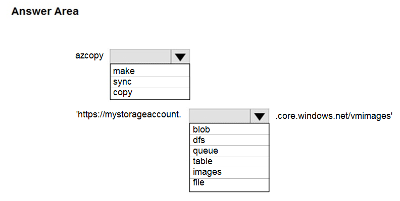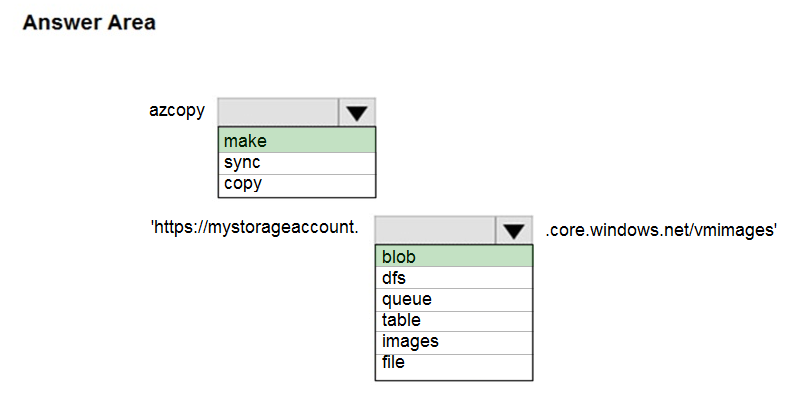 您有一个包含 Azure 存储帐户的 Azure 订阅。 您计划将本地虚拟机映像复制到名为 vmimages 的容器中。 您需要为计划的图像创建容器。 您应该运行哪个命令?要回答这个问题,请在答案区域中选择相应的选项。 注意:每个正确选择值一分。 热点区域:热点 -