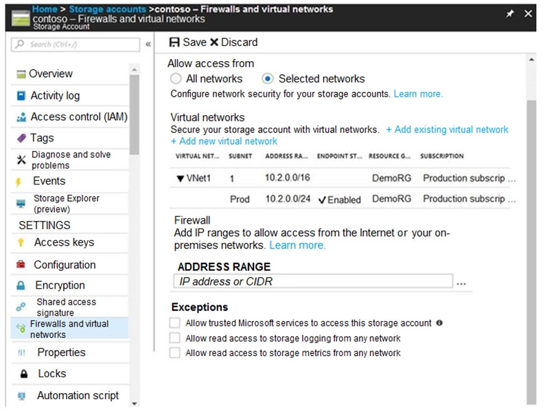 您在名为 VNet1 的虚拟网络上拥有多个 Azure 虚拟机。 您可以配置 Azure 存储帐户,如下图所示。热点 -