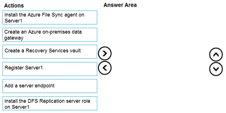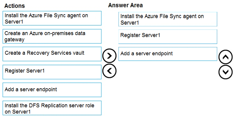 您有一个名为 Server1 的本地文件服务器,运行 Windows Server 2016。 您有一个包含 Azure 文件共享的 Azure 订阅。 您部署 Azure 文件同步存储同步服务,并创建同步组。 您需要将文件从 Server1 同步到 Azure。 你应该按顺序执行哪三个操作?要回答这个问题,请将相应的操作从操作列表中移到答案区域,并按正确的顺序排列它们。 选择并放置:热点 -