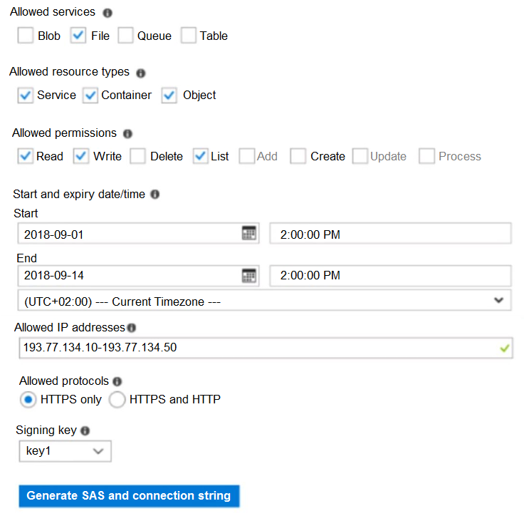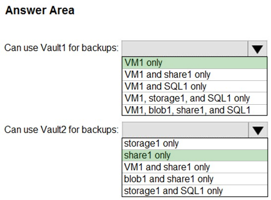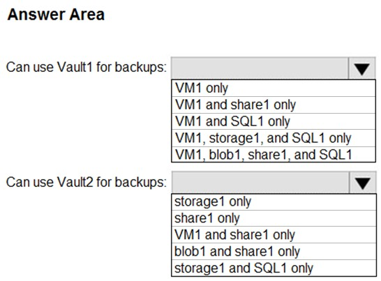 您有一个名为 Subscription1 的 Azure 订阅。 在 Subscription1 中,创建一个名为 share1 的 Azure 文件共享。 您创建一个名为 SAS1 的共享访问签名 (SAS),如下图所示:您有两台 Azure 虚拟机,分别名为 VM1 和 VM2。您有两个恢复服务保管库,分别名为 RSV1 和 RSV2。