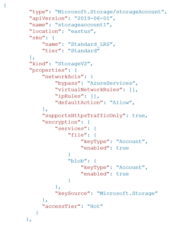 您有一个 Azure 订阅,其中包含一个名为 storageaccount1 的 Azure 存储帐户。 将 storageaccount1 导出为 Azure 资源管理器模板。该模板包含以下部分。您有一个 Azure 订阅,其中包含一个名为 storage1 的存储帐户。