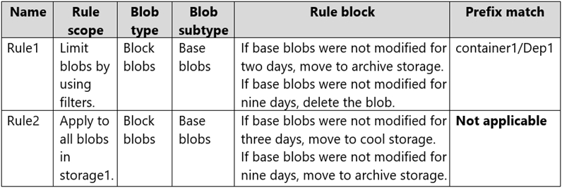 你有一个名为 storage1 的 Azure 存储帐户,其中包含一个 Blob 容器。该 Blob 容器的默认访问层级为“热”。Storage1 包含一个名为 conainer1 的容器。 您在 storage1 中创建生命周期管理规则,如下表所示。您正在为名为 storage1 的 Azure 存储帐户配置 Azure Active Directory (Azure AD) 身份验证。